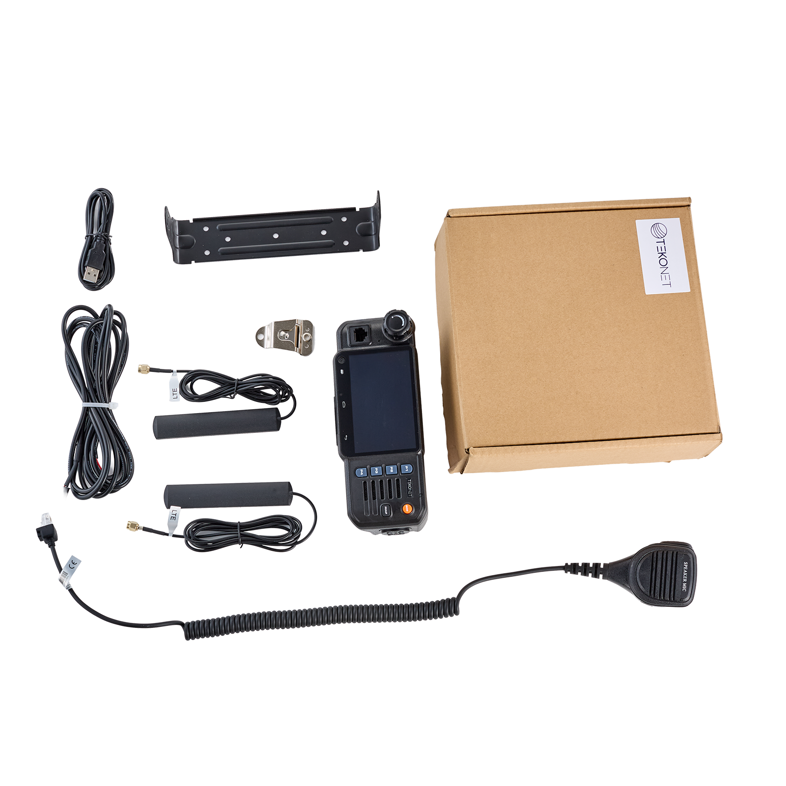 In The Box Radio, USB Cable, Bracket, Power Cable, Speaker Mic, and Installation Accessories